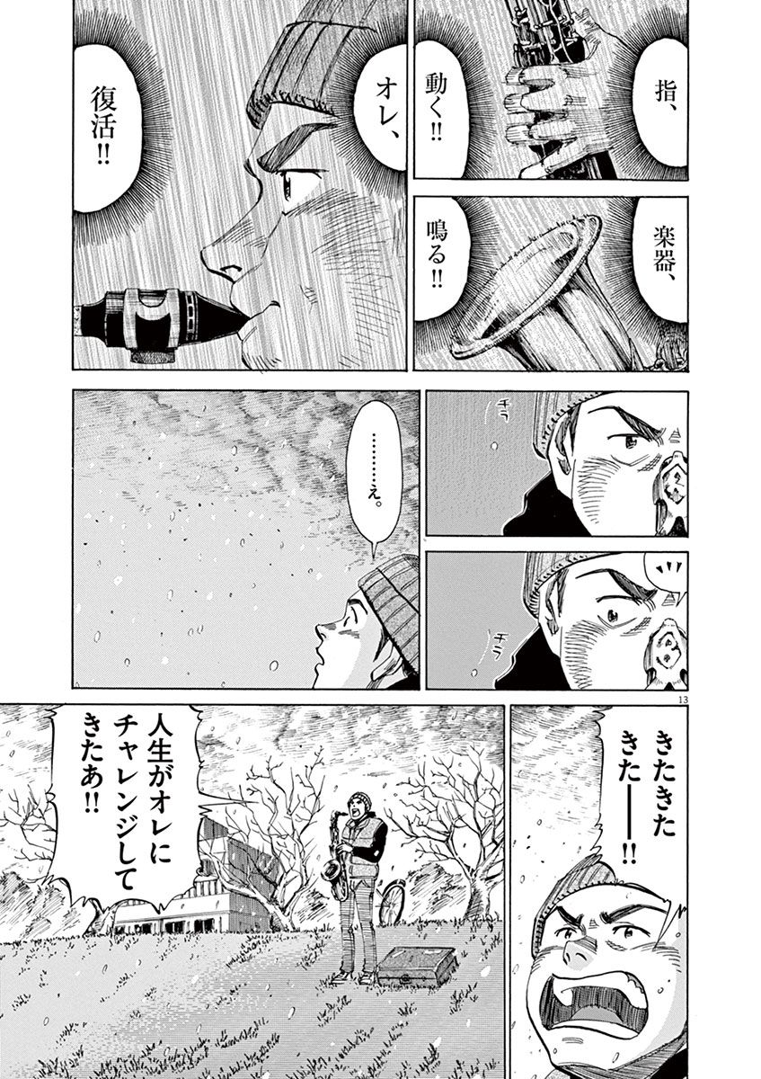 中学生の頃、友人に誘われたライブで大はジャズにハートを撃ち抜かれました。それ以来、彼は密かに独学でジャズと向き合ってきたのです。そのときの衝撃を胸に抱いたまま……。テナーサックスを手にしてから最初の2年間はまったくの我流。大が“教科書”にしたのは1950~60年代のジャズ全盛期に活躍したモダン・ジャズの巨人たちの名盤でした。そんな彼の練習方法は、河川敷に立って大音量でサックスを吹き続けること。雨の日には丘のトンネルの中で、同じように吹き続ける。そんな生活を1日も休まずに、ひたすら大は繰り返します。寒い雪の夜でさえ、「人生がオレにチャレンジしてきたぁ!!」という具合で、ただただ吹き続けるのです。辺りに雪が積もって音が吸収されてしまい、さすがにめげそうになるのですが……それでも踏みとどまり、大は粘り強く吹き続ける。