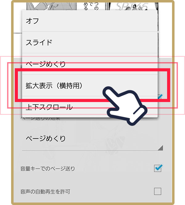 表示されるメニューの「ページ送りの効果」から「拡大表示(横持用)」を選択する