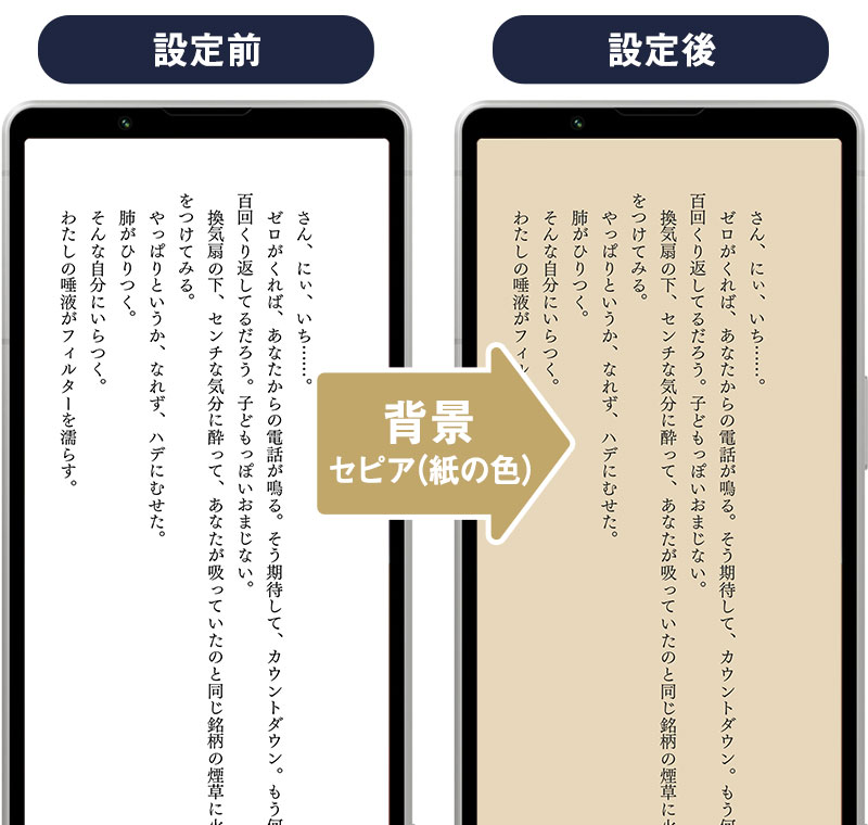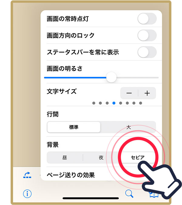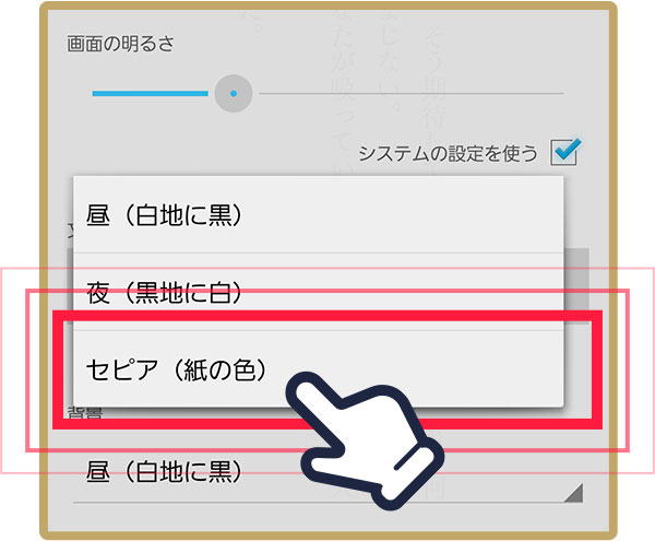 表示されるメニューの「背景」から「セピア(紙の色)」を選択する
