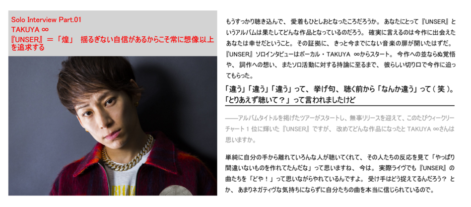 滋賀県出身の6人組ロックバンド。TAKUYA∞(Vocal)、 克哉(Guitar)、 信人(Bass)、 誠果(Sax,Manipulator)、 彰(Guitar)、真太郎(Drums)からなる滋賀県出身のロックバンド。