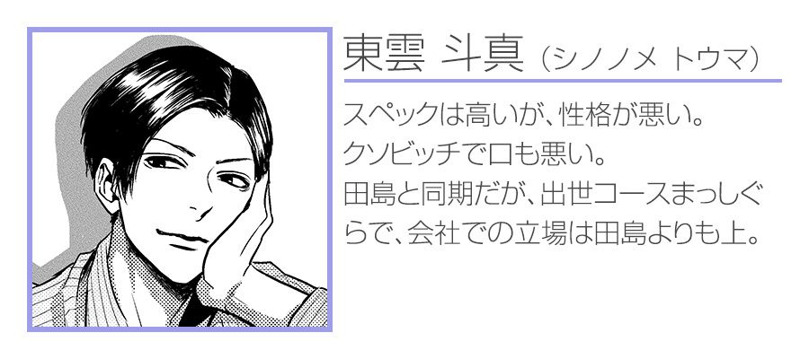 一番繊細な思春期をいじめられて過ごした田島(タジマ)。黒歴史を封印して就活に励み、何とか大きな会社に就職した…が!そこには、大っ嫌いないじめっ子の東雲斗真(シノノメ トウマ)がいた!会社でも、中学時代と同様にからんでくる東雲。でもまさか!まさかっ!! そんな奴と、こんなことになるなんてー???