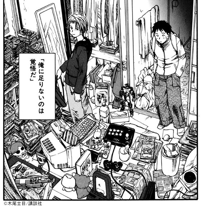高坂の自室に足を踏み入れ、自分の半端さを痛感する笹原。グッズ描写の細かさにも注目を。