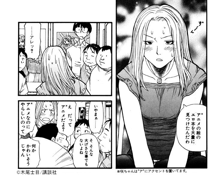 まずは春日部 咲(以下、咲ちゃん)の導入例から。咲ちゃんはその筋のジャンルに全く興味がないにも関わらず、たまたま顔で選んだ彼氏・高坂真琴(こうさか まこと)がガチのそっち系で、仕方なく現視研に加入してしまう。観てるアニメもジブリくらいで、しかも「アニメ」じゃなくて「ジブリ」という枠。わかります? 作中にもありますが、「アニメ」のアクセントからして微塵もオタクじゃない。