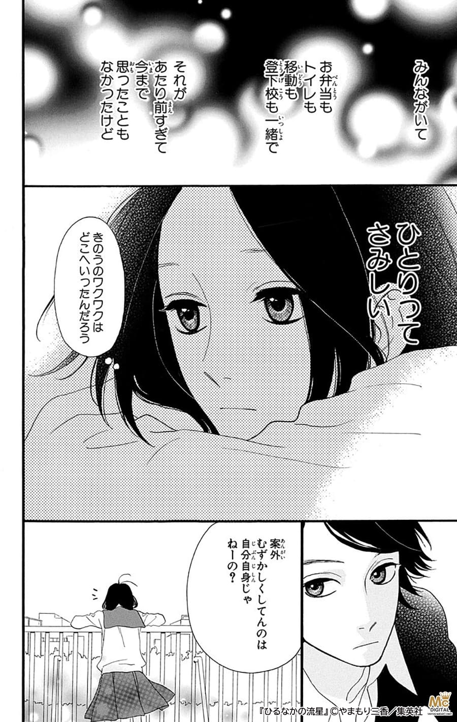 すずめと馬村のカフェデート。周りがカップルだらけになってしまった、猿丸。すずめの選択から6年後の獅子尾や、男女逆転展開などひるなかのキャラ達が輝き続ける1冊。金沢を舞台にした読みきりもオールカラーで収録! 【収録作品】二人の日常/猿丸小鉄のあたまの中/隣の男/男女逆転 ひるなかの流星/Black Pink/はつ恋むらさき