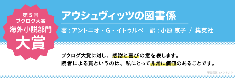 第二次世界大戦中の逸話をもとにした小説、『アウシュヴィッツの図書係』がブクログ大賞海外小説部門を制しました!本とその豊かな世界を死守しようと試みる少女たちの雄姿を描くことで、劣悪な極限状況の中でも失われない本の価値、人間性の価値を示す作品です。小さな英雄たちと、本の意味を描いたこの作品にも多くのコメントが寄せられました。大賞をきっかけに、多くの方々の目にふれることを願ってやみません。ブクログ大賞受賞、おめでとうございます。