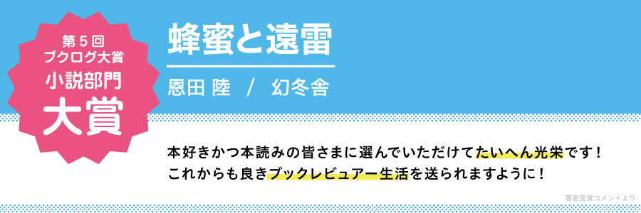 ブクログ大賞とは、本好きのみなさんで本当におもしろい本を決める書籍大賞です。対象作品の中からブクログで総合評価の高い作品をノミネート作品として選出し、みなさんの投票でそれぞれの部門の大賞作品を決定しています。