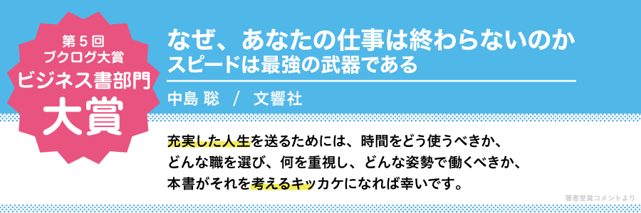 ブクログ大賞ビジネス部門を制したのは、中島聡さんの『なぜ、あなたの仕事は終わらないのか』です! ブクログのみなさんも、多くの方が本棚にこの本を登録してくださっていました。速さこそが全てを制す。そんな元マイクロソフト伝説のプログラマーが語る仕事術と心構えに、多くの人が感銘を受けているようです。様々なメッセージが受け取れる一冊ですので、ぜひ手にとってご覧くださいませ。