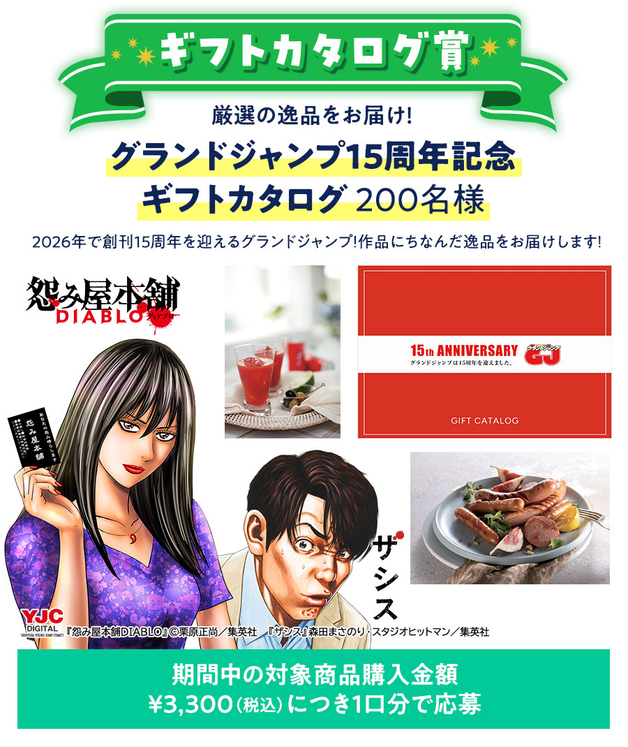 ※グランドジャンプの作品にちなんだ厳選グルメ、ギフトを中心に掲載した、本キャンペーンオリジナルの集英社オリジナルギフトカタログです。カタログ内のお好きな商品を選んで受け取ることができます。