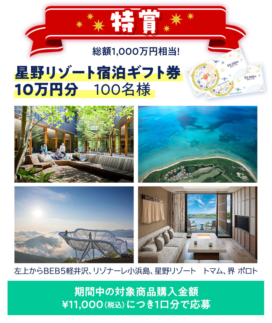 ※ 「星野リゾート宿泊ギフト券」の対象宿や使用方法については下記「星野リゾート」サイト(外部サイトへ移動します)をご参照ください。