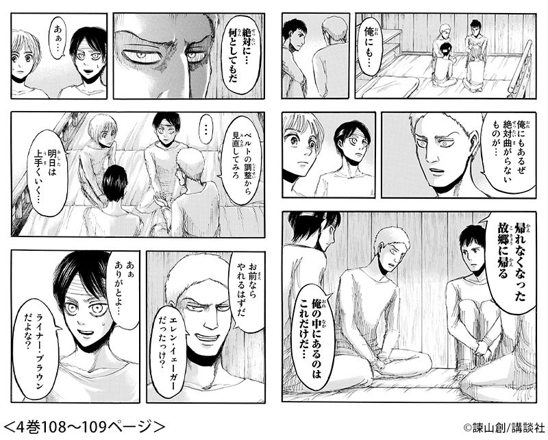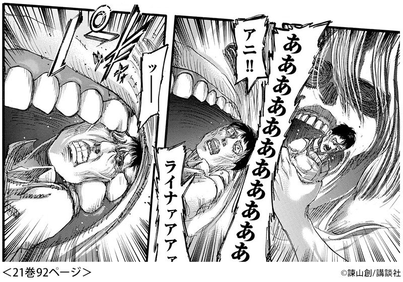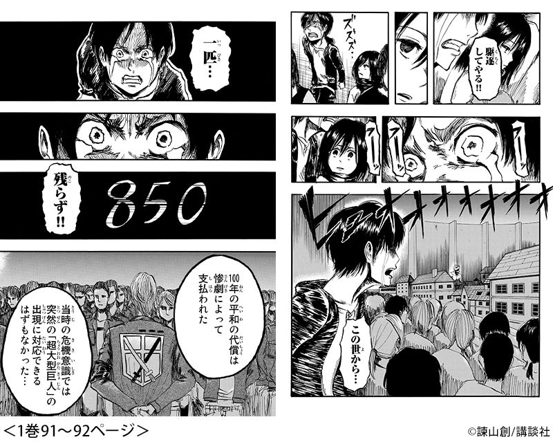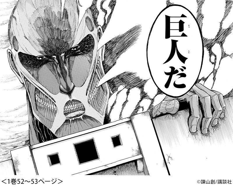 そして、このページの編集者コメントにもあるよう「作者の強い気持ちが伝わってくる絵」であることも本作がヒットした理由の一つであると言えるでしょう。エレンの怒りと憎しみを、正義や平和といった“きれいごと”のフィルターを通さず、プリミティブなままブチまけた表現は、少年マンガとしてはかなり異質なもの。この従来の少年マンガにはあり得なかった「絶望」と「憤怒」のミクスチャーが本作の根源的な魅力なのです。