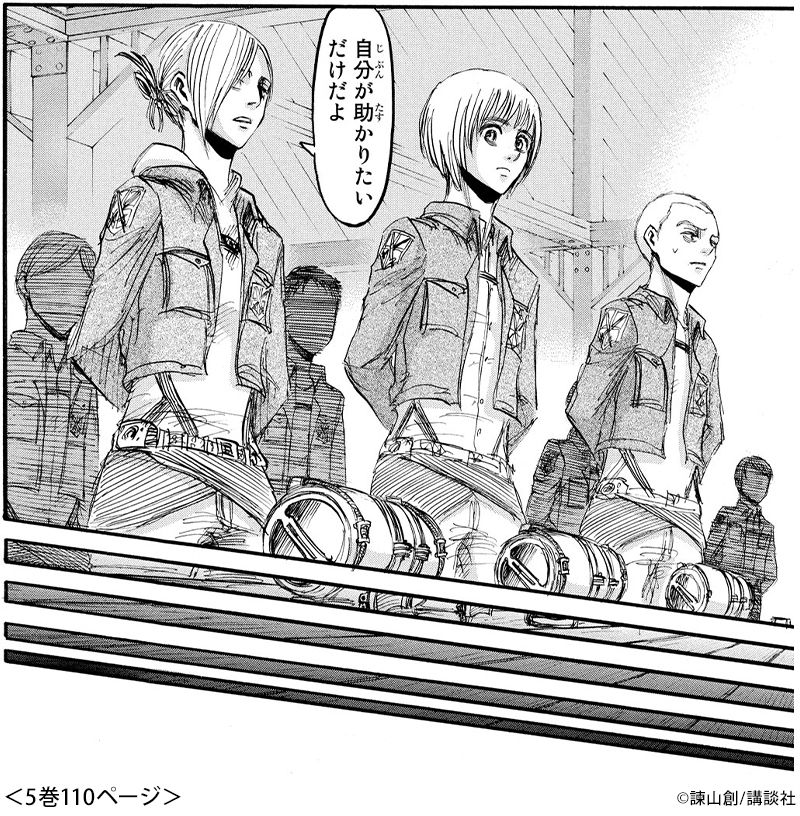 たとえばこのシーン(第5巻21話『開門』より)、なんで中央のアルミンの目線がおかしな方向を向いているのかわかりますか? この謎は比較的早く明かされるのですが、わかった瞬間「そういうことだったのか!」と脳汁がドバドバ流れますよ。新人とは思えぬ諫山先生の構成力には舌を巻くばかりです。