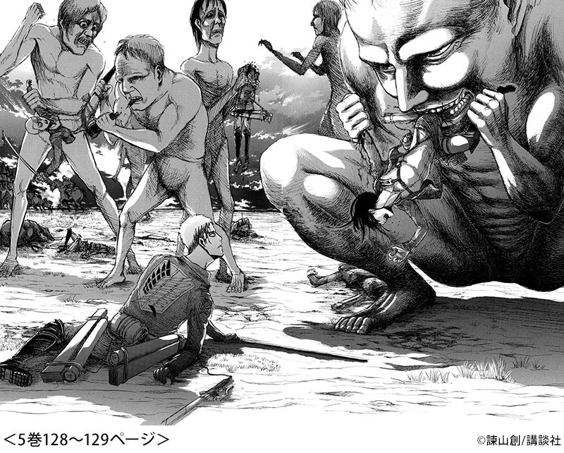 連載開始当時「理科室の人体解剖模型かよ!」と盛り上がったのを覚えている方も多いのではないでしょうか。この超大型巨人(全長60m!)以外の巨人も、手足が妙に細く顔は大きかったりとアンバランスな体型でインパクト大。無邪気に人を喰らうさまにまるで知性が感じられないところも恐ろしく、その“キモ怖”ぶりが醸し出す絶望感に多くの読者が震えました。