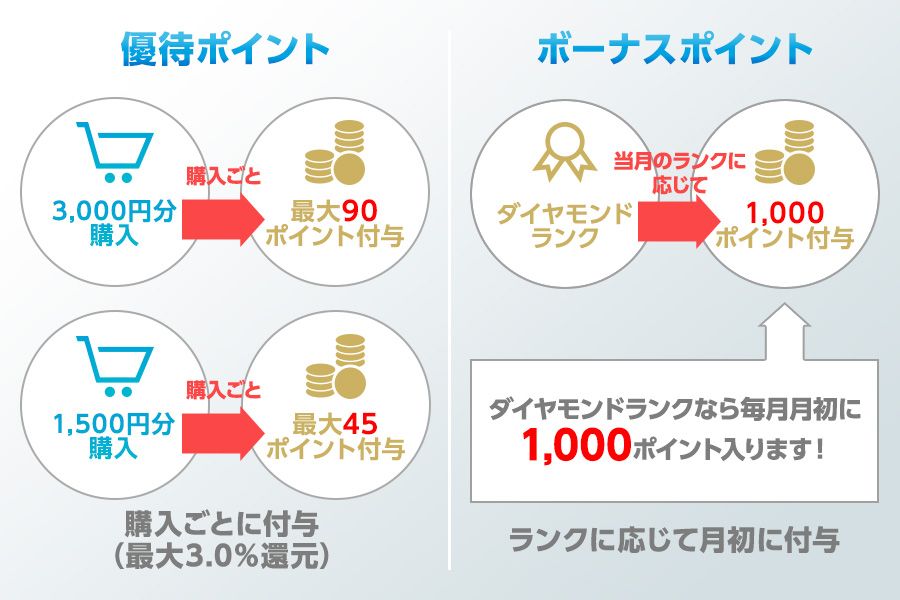 「優待ポイント」とは、商品を購入ごとに金額に応じて付与されるポイントのことです。「ボーナスポイント」とは、月初に付与されるポイントのことです。