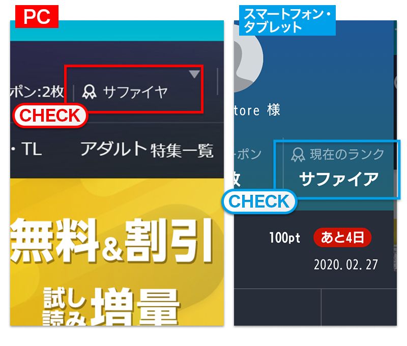 優待ランクの確認は、PCの場合ページ右上部、スマートフォン・タブレットはメニューを開くと確認することができます。また、マイページでも確認することができます。