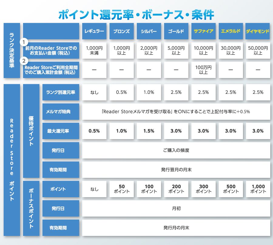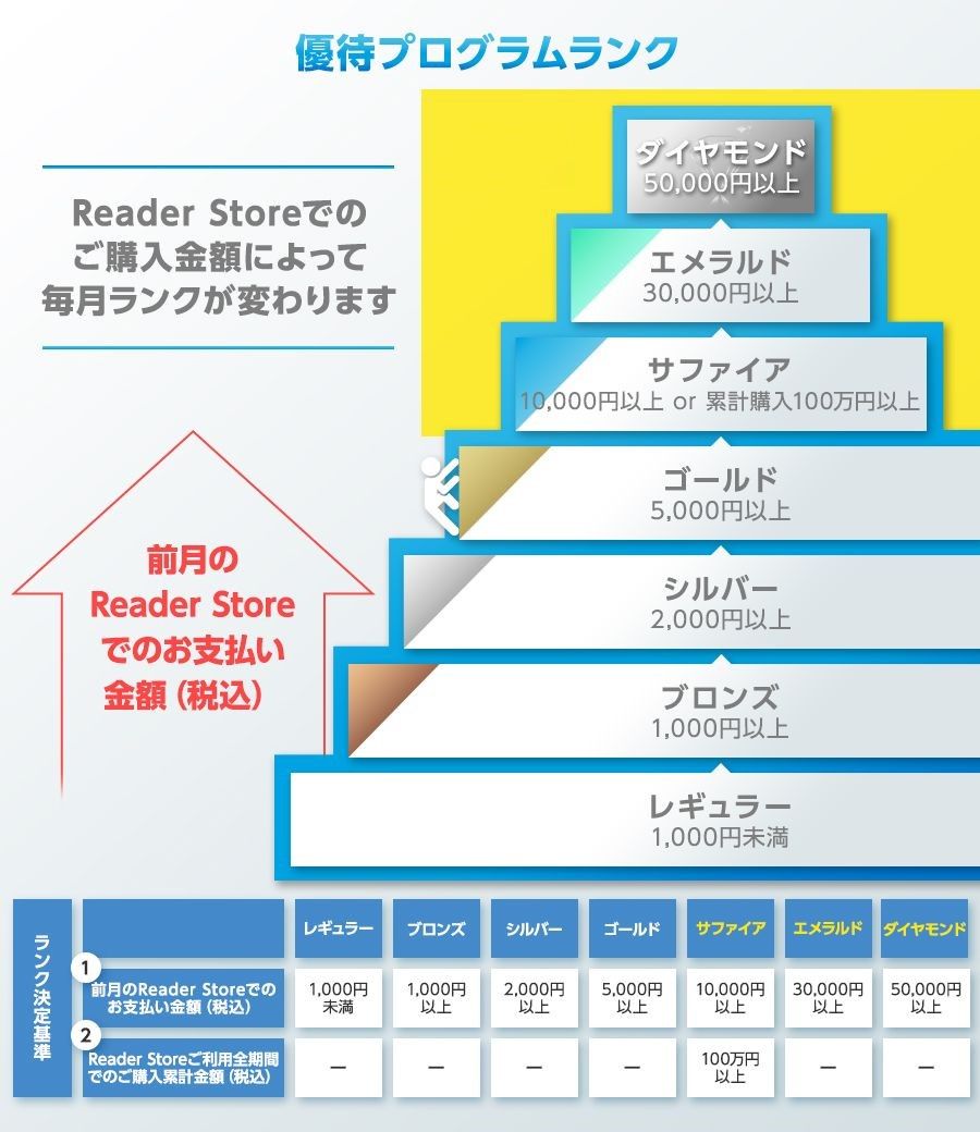 Reader Storeでは、本のご購入金額に応じて会員ランクがアップする優待プログラムをご用意しています。買えば買うほどお得になる、本好きには嬉しいポイント還元プログラムです。