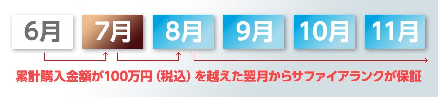 ご利用全期間のご購入累計金額が100万円(税込)を超えたお客様は前月の購入金額に関わらずサファイアランクが保証されます。