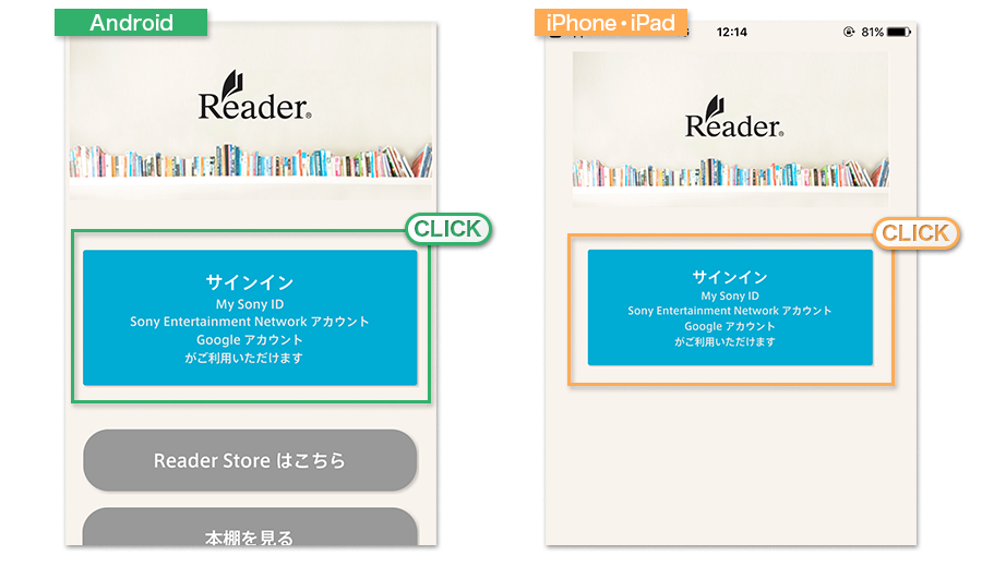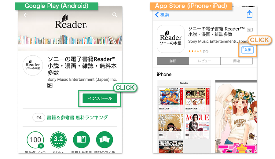 お手持ちのスマートフォン・タブレットにReader Storeアプリをダウンロードしてください。