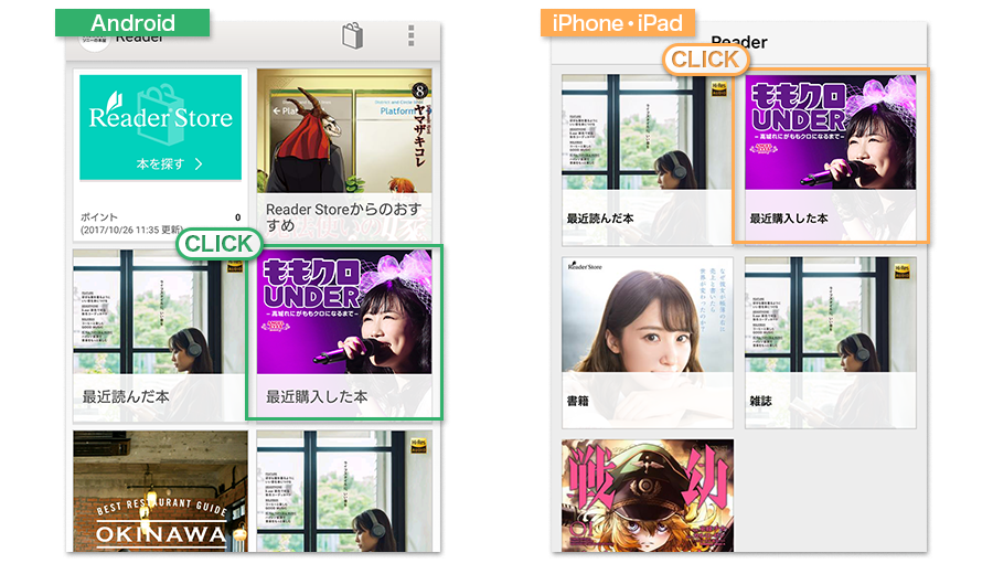 Reader Storeアプリのサインインが完了したら、「最近購入した本」に『ももクロUNDER ~高城れにがももクロになるまで~』が表示されるので、「最近購入した本」をクリックしてください。