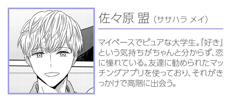 話を聞くと高階も恋活中のようで、彼の柔らかい雰囲気もあり、盟は実は“好き”という気持ちがよく分からず、恋に憧れていると話してしまう。