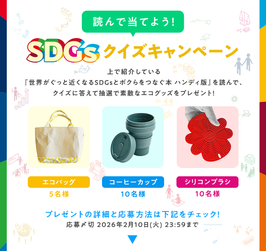 上で無料公開している『世界がぐっと近くなるSDGsとボクらをつなぐ本 ハンディ版』(学研)を読んで、クイズに答えると環境に配慮したエコグッズなエコグッズが当たります。知識を得て、素敵なエコ商品もゲットしましょう。