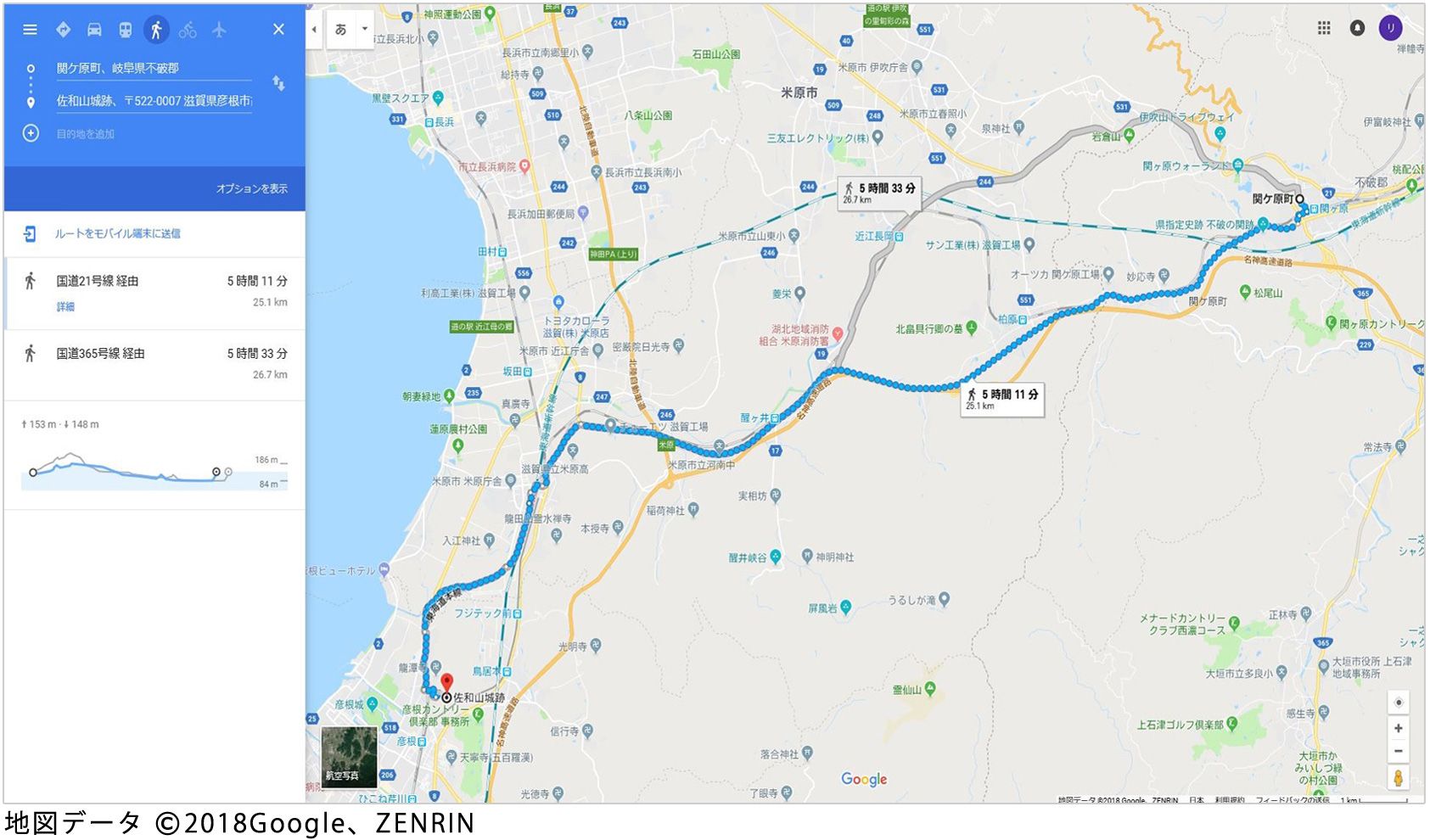 井沢 これは何の地図かというと、関ヶ原は岐阜県にあるんだけど、彼の当時の本拠であった佐和山城までどのくらいで行けるかといえば、現代の人の足でも5時間半くらいで行ける。馬を飛ばせば、すぐ行ける。
