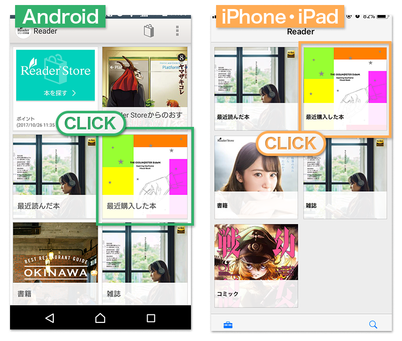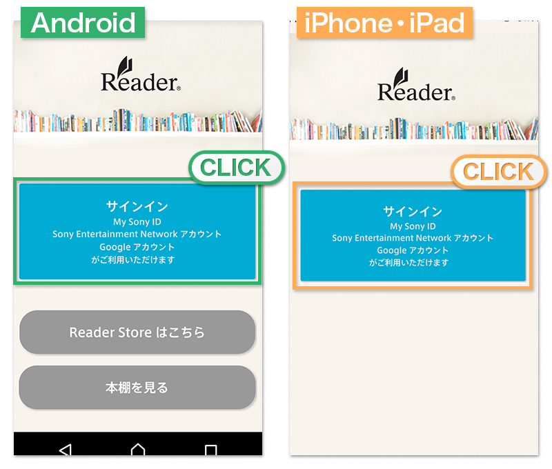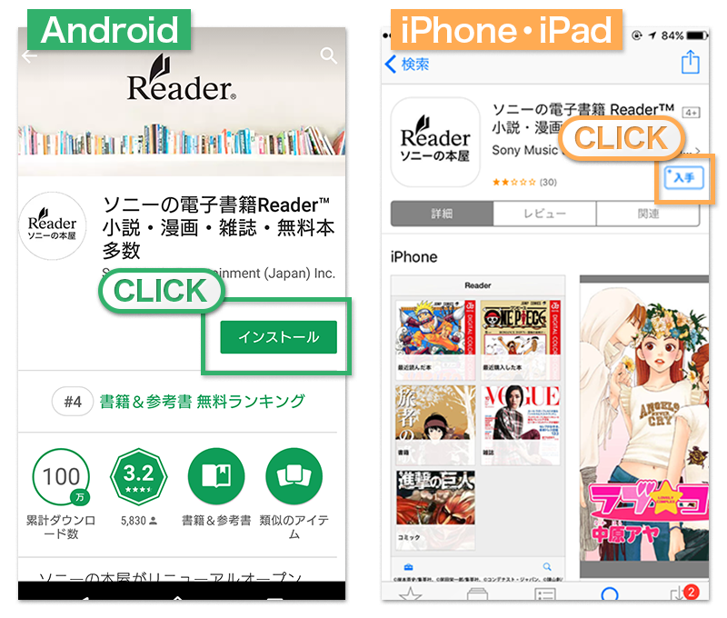 お手持ちのスマートフォン・タブレットに、Google PlayまたはApp Storeで、Reader Storeアプリをダウンロードしてください。