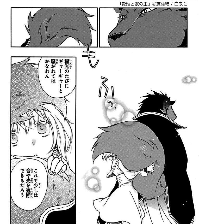 少女マンガに登場する人外キャラというと、人間の姿に獣耳をつけたイケメンが主流ですよね。それももちろん大好物ですが、本作の魅力の1つは、王様が“大きな牙とモフモフの毛皮を持った獣”だということです。さきほど触れた、王の真実の姿というのは“魔族と人間のハーフ”であること。彼は月の光が射す天啓の夜にだけ人間の姿を現します。しかし、その時以外はずっとビーストモードなのです…! 獣耳イケメンがときどき獣姿になるという従来の設定とは真逆です。