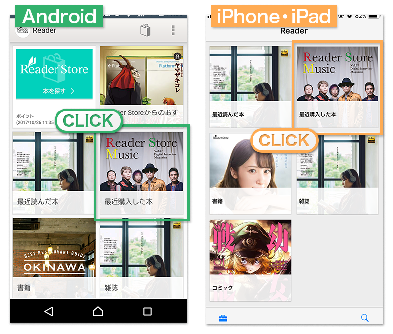 “Reader”アプリのサインインが完了したら、「最近購入した本」に『Reader Store Music』が表示されるので、「最近購入した本」をクリックしてください。