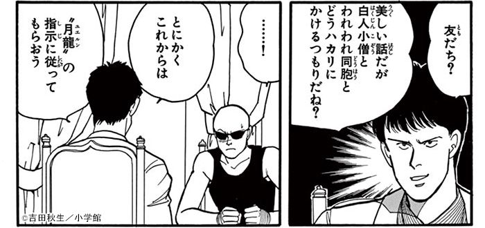 アッシュと英二は「バナナ・フィッシュ」の謎をめぐる陰謀に巻き込まれていきます。キーマンとして大人に利用されるアッシュに希望を与えるのは、非力で優しい親友・英二でした。