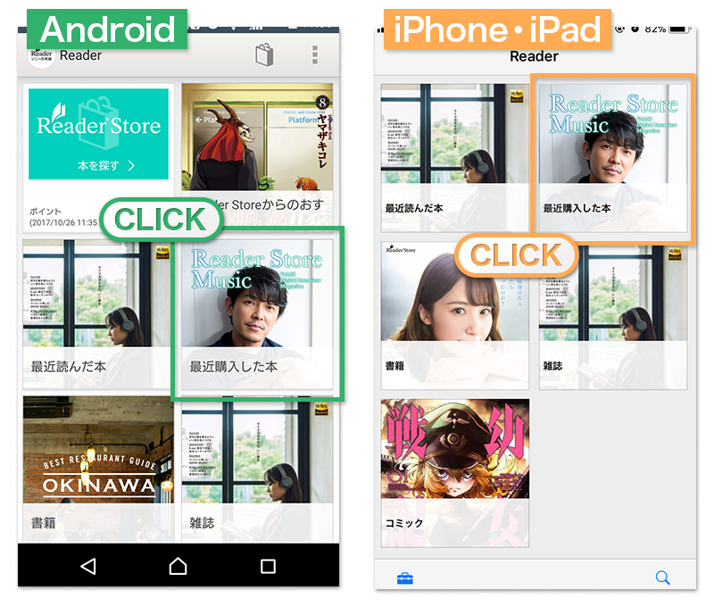 “Reader”アプリのサインインが完了したら、「最近購入した本」に『Reader Store Music』が表示されるので、「最近購入した本」をクリックしてください。